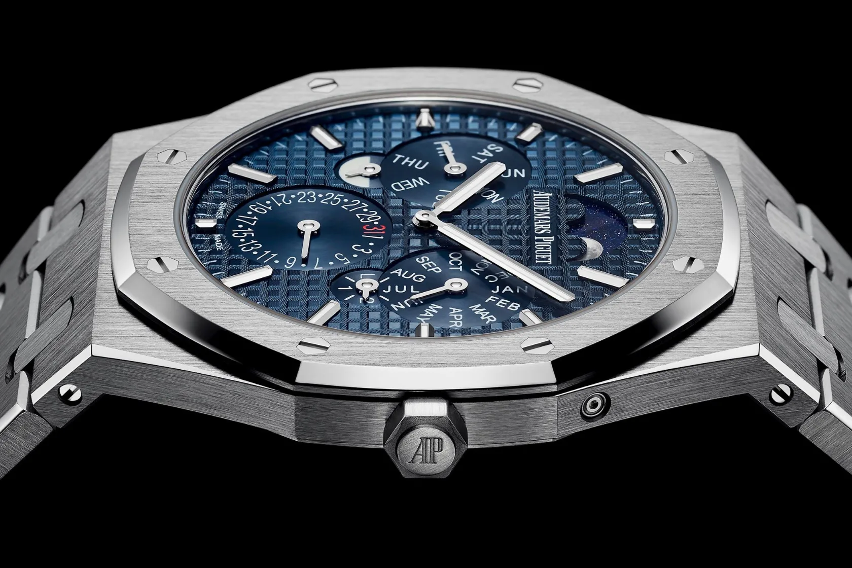 • پرداخت نهایی (Finishing): هر سطح از بدنه و دستبند رویال اوک، ترکیبی هنرمندانه از سطوح برس‌خورده (satin-brushed) و لبه‌های کاملاً صیقلی (mirror-polished) است. این پرداخت که با دست انجام می‌شود، چنان دقیق است که نور را به شکلی منحصربه‌فرد منعکس می‌کند و کمتر برندی در جهان قادر به اجرای آن با این کیفیت است.