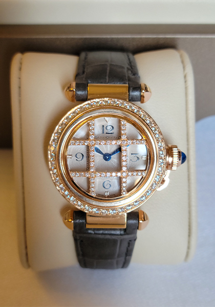 ساعت به مثابه جواهر: پنتیر بیش از یک ساعت، یک قطعه جواهر است. قاب مربعی کوچک و ظریف آن با پیچهای آشکار، یادآور مدل سانتوس است، اما حس کلی آن بسیار زنانهتر و لوکستر است.