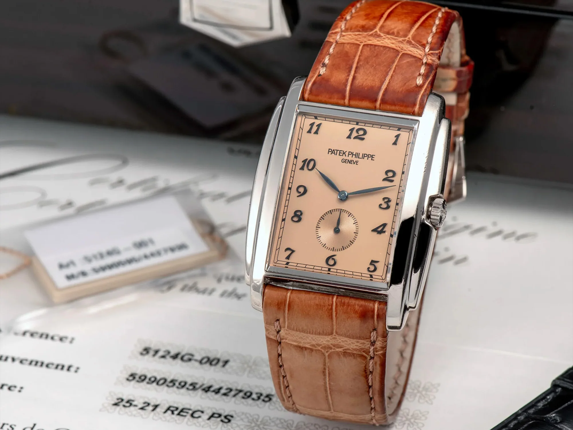 تاریخچه مجموعه گوندولوی پتک فیلیپ به سال ۱۸۷۲ بازمیگردد، زمانی که این کارخانه سوئیسی شروع به ساخت ساعتهای جیبی و مچی کرد که منحصر به خردهفروش برزیلی گوندولو و لابوریو بودند و تأثیر جنبش آرت دکو را که بر اوایل قرن بیستم غالب بود، داشتند. رفرنس ۵۱۲۴ در سال ۲۰۰۹ عرضه شد و با قاب مستطیلی با الهام از معماری، با لبههای پلهای و کریستال خمیده متمایز بود. پشت صفحه ظریف آن، با اعداد عربی یادآور آن دوره و یک صفحه فرعی ثانیهشمار کوچک، یک موتور مکانیکی مستطیلی شکل، کالیبر 25-21 REC PS، قرار دارد که تزئینات زیبای خود را پشت یک درب پشتی سافایر به نمایش میگذارد.