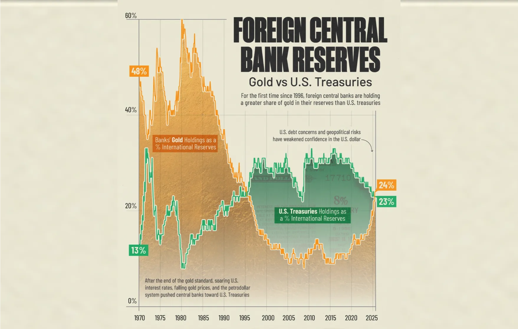 (نکته آماری: برای اولین بار از سال ۱۹۹۶، بانکهای مرکزی سهم بیشتری از ذخایر خود را به طلا (۲۴٪) اختصاص دادهاند تا اوراق خزانه آمریکا (۲۳٪).)