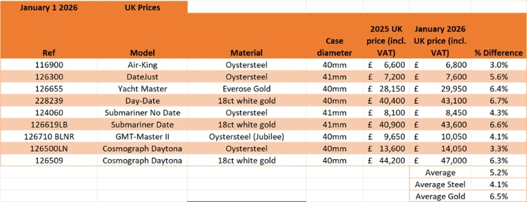 • طلا در برابر استیل: نکته قابل توجه اینجاست که ساعت‌های تمام طلا یا ترکیبی (Two-tone) افزایش قیمت بیشتری را تجربه کرده‌اند (حدود ۶.۵٪ در بریتانیا)، در حالی که مدل‌های استیل افزایش ملایم‌تری (حدود ۴.۱٪) داشته‌اند.