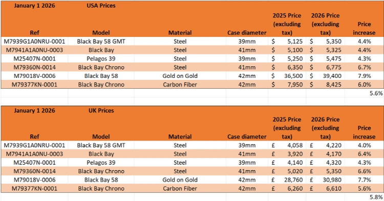 • مدل‌های طلا: مدل Black Bay 58 تمام طلا، با جهشی چشمگیر حدود ۷.۷٪ گران‌تر شده است که نشان‌دهنده تأثیر مستقیم قیمت طلا بر این برند است.